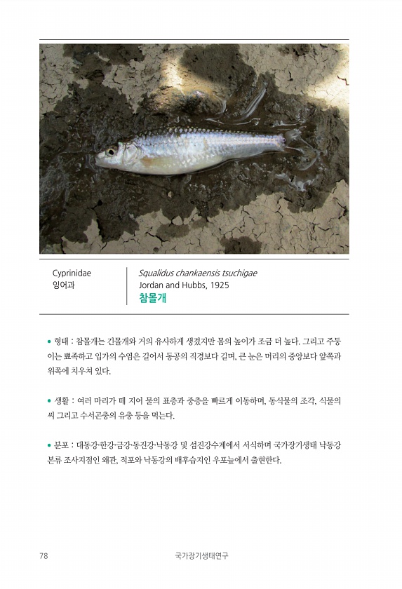 78 국가장기생태연구 ? 형태 참몰개는 긴몰개와 거의 유사하게 생겼지만 몸의 높이가 조금 더 높다. 그리고 주둥 이는 뾰족하고 입가의 수염은 길어서 동공의 직경보다 길며, 큰 눈은 머리의 중앙보다 앞쪽과 위쪽에 치우쳐 있다. ? 생활 여러 마리가 떼 지어 물의 표층과 중층을 빠르게 이동하며, 동식물의 조각, 식물의 씨 그리고 수서곤충의 유충 등을 먹는다. ? 분포 대동강·한강·금강·동진강·낙동강 및 섬진강수계에서 서식하며 국가장기생태 낙동강 본류 조사지점인 왜관, 적포와 낙동강의 배후습지인 우포늪에서 출현한다. Cyprinidae 잉어과 Squalidus chankaensis tsuchigae Jordan and Hubbs, 1925참몰개
