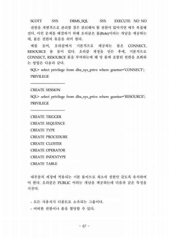 SCOTT SYS DBMS_SQL SYS EXECUTE NO NO 권한을 개별적으로 관리할 경우 관리해야 할 권한이 많아지면 매우 복잡해 진다. 이런 문제를 해결하기 위해 오라클은 롤 Role 이라는 개념을 제공하는 데, 롤은 권한의 묶음을 의미 한다. 예를 들어, 오라클에서 기본적으로 제공하는 롤은 CONNECT, RESOURCE 롤 등이 있다. 오라클 계정을 만든 후에, 기본적으로 CONNECT, RESOURCE 롤을 부여하는데 해 당 롤에 포함된 권한을 조회하 는 방법은 다음과 같다. SQL select privilege from dba_sys_privs where grantee=CONNECT; PRIVILEGE ------------------------------ CREATE SESSION SQL ...
