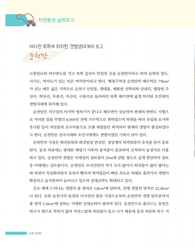 순천 순천만 여자만 북쪽에 위치한 갯벌생태계의 보고 순천만 고흥반도와 여수반도를 끼고 북쪽 깊숙이 만입된 곳을 순천만이라고 하며 남쪽의 장도, 사기도, 여자도가 있는 만은 여자만이라고 한다. 행정구역상 순천만의 해수역은 75km2 가 넘는 매우 넓은 지역으로 순천시 인안동, 대대동, 해룡면 선학리와 상내리, 별량면 우 산리, 학산리, 무풍리, 마산리, 구룡리로 둘러싸인 북쪽 해수면에 넓게 퇴적된 조간대의 갯벌지대에 위치해 있다. 순천만은 지구상의 마지막 빙하기가 끝나고 해수면이 상승하며 현재의 한반도 지형으 로 자리를 잡을 무렵인 8,000년 전에 기수역으로 변하였으며 하천을 따라 유입된 토사와 유기물 등이 바닷물의 조수작용으로 오랜 세월동안 퇴적되어 현재의 갯벌이 형성되었다 고 한다. 순천만은 삼국시대와 ...