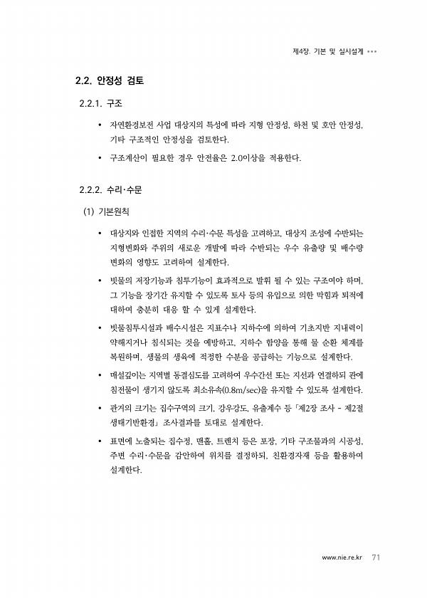 www.nie.re.kr 71 제4장. 기본 및 실시설계 2.2. 안정성 검토 2.2.1. 구조 자연환경보전 사업 대상지의 특성에 따라 지형 안정성, 하천 및 호안 안정성, 기타 구조적인 안정성을 검토한다. 구조계산이 필요한 경우 안전율은 2.0이상을 적용한다. 2.2.2. 수리?수문 1 기본원칙 대상지와 인접한 지역의 수리?수문 특성을 고려하고, 대상지 조성에 수반되는 지형변화와 주위의 새로운 개발에 따라 수반되는 우수 유출량 및 배수량 변화의 영향도 고려하여 설계한다. 빗물의 저장기능과 침투기능이 효과적으로 발휘 될 수 있는 구조여야 하며, 그 기능을 장기간 유지할 수 있도록 토사 등의 유입으로 의한 막힘과 퇴적에 대하여 충분히 대응 할 수 있게 설계한다. 빗물침투시설과 배수시설은 지표수나 지하수에 의하...