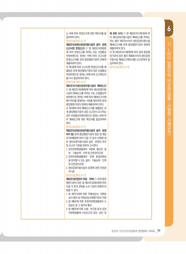 6 환경부 유전자변형생물체 안전관리 가이드 _79 1 L M O 법령단위 비교표 법률- 시행령- 시행규칙 는 바에 따라 변경신고에 대한 확인서를 발 급하여야 한다. [본조신설 2013.12.11] 제23조의10 생산공정이용시설의 설치ㆍ운영 신고사항 변경신고 ① 법 제22조의3제3항 에 따라 변경신고를 하려는 자는 산업통상 자원부령으로 정하는 바에 따라 신고사항 변경신고서를 관계 중앙행정기관의 장에게 제출하여야 한다. ② 제1항에 따라 신고사항 변경신고서를 제 출받은 관계 중앙행정기관의 장은 산업통상 자원부령으로 정하는 바에 따라 신고확인서 를 다시 발급하여야 한다. [본조신설 2013.12.11] 제23조의11 생산공정이용시설의 폐쇄신고 ① 법 제22조의3제4항에 따라 생산공정이용 시설의 폐쇄신고를 하려는 ...