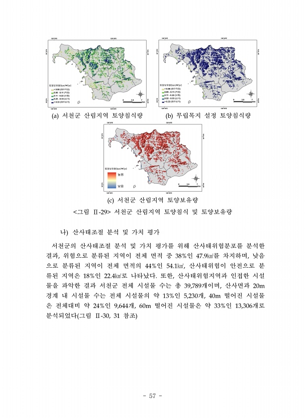 57 서천군 산림지역 토양침식량 무립목지 설정 토양침식량 서천군 산림지역 토양보유량 그림 서천군 산림지역 토양침식 및 토양보유량 나 산사태조절 분석 및 가치 평가 서천군의 산사태조절 분석 및 가치 평가를 위해 산사태위험분포를 분석한 결과 위험으로 분류된 지역이 전체 면적 중 인 를 차지하며 낮음 으로 분류된 지역이 전체 면적의 인 산사태위험이 안전으로 분 류된 지역은 인 로 나타났다 또한 산사태위험지역과 인접한 시설 물을 파악한 결과 서천군 전체 시설물 수는 총 개이며 산사면과 경계 내 시설물 수는 전체 시설물의 약 인 개 떨어진 시설물 은 전체대비 약 인 개 떨어진 시설물은 약 인 개로 분석되었다 그림참조