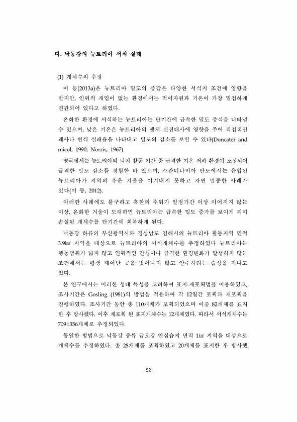 -52- 다. 낙동강의 뉴트리아 서식 실태 1 개체수의 추정 이 등 2013a 은 뉴트리아 밀도의 증감은 다양한 서식지 조건에 영향을 받지만, 인위적 개입이 없는 환경에서는 먹이자원과 기온이 가장 밀접하게 연관되어 있다고 하였다. 온화한 환경에 서식하는 뉴트리아는 단기간에 급속한 밀도 증식을 나타낼 수 있으며, 낮은 기온은 뉴트리아의 생체 신진대사에 영향을 주어 직접적인 폐사나 번식 실패율을 나타내고 밀도의 감소를 보일 수 있다 Doncater and micol, 1990; Norris, 1967 영국에서는 뉴트리아의 퇴치 활동 기간 중 급격한 기온 저하 환경이 조성되어 급격한 밀도 감소를 경험한 바 있으며, 스칸디나비아 반도에서는 유입된 뉴트리아가 지역의 추운 겨울을 이겨내지 못하고 자연 멸종한 사례가 있...