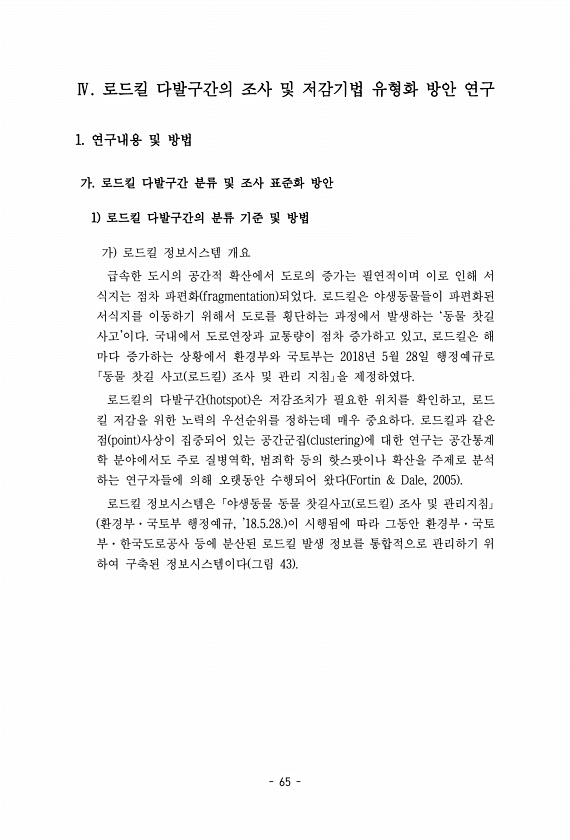 65 Ⅳ. 로드킬 다발구간의 조사 및 저감기법 유형화 방안 연구 1. 연구내용 및 방법 가. 로드킬 다발구간 분류 및 조사 표준화 방안 1 로드킬 다발구간의 분류 기준 및 방법 가 로드킬 정보시스템 개요 급속한 도시의 공간적 확산에서 도로의 증가는 필연적이며 이로 인해 서 식지는 점차 파편화 fragmentation 되었다. 로드킬은 야생동물들이 파편화된 서식지를 이동하기 위해서 도로를 횡단하는 과정에서 발생하는 `동물 찻길 사고이다. 국내에서 도로연장과 교통량이 점차 증가하고 있고, 로드킬은 해 마다 증가하는 상황에서 환경부와 국토부는 2018년 5월 28일 행정예규로 ?동물 찻길 사고 로드킬 조사 및 관리 지침?을 제정하였다. 로드킬의 다발구간 hotspot 은 저감조치가 필요한 위치를 확인하고, 로드 ...