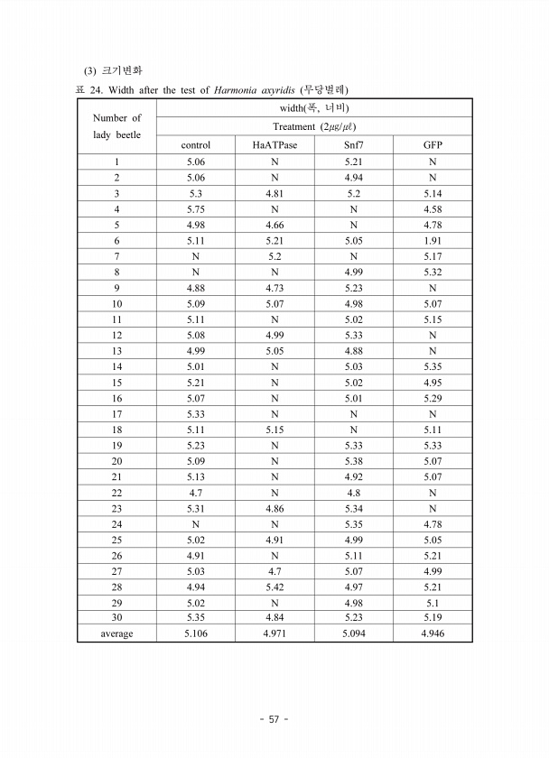 57 3 24. Width after the test of Harmonia axyridis Number of lady beetle width , Treatment 2㎍/㎕ control HaATPase Snf7 GFP 1 5.06 N 5.21 N 2 5.06 N 4.94 N 3 5.3 4.81 5.2 5.14 4 5.75 N N 4.58 5 4.98 4.66 N 4.78 6 5.11 5.21 5.05 1.91 7 N 5.2 N 5.17 8 N N 4.99 5.32 9 4.88 4.73 5.23 N 10 5.09 5.07 4.98 5.07 11 5.11 N 5.02 5.15 12 5.08 4.99 5.33 N 13 4.99 5.05 4.88 N 14 5.01 N 5.03 5.35 15 5.21 N 5.02 4...
