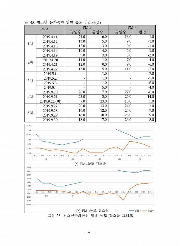 61 a PM10농도 감소율 F PM2.5농도 감소율 그림 35. 청소년문화공원 일별 농도 감소율 그래프 구분 PM10 PM2.5 침엽수 활엽수 침엽수 활엽수 1차 2019.4.11. 21.0 6.0 16.0 -1.0 2019.4.12. 13.0 5.0 9.0 -1.0 2019.4.13. 12.0 3.0 9.0 -1.0 2019.4.14. 10.0 4.0 5.0 -1.0 2차 2019.4.19. 9.0 3.0 5.0 -2.0 2019.4.20 11.0 1.0 7.0 -4.0 2019.4.21. 12.0 0.0 9.0 -6.0 2019.4.22. 15.0 5.0 11.0 -2.0 3차 2019.5.1. 1.0 -7.0 2019.5.2. 1.0 -7.0 2019.5.3. 1.0 -6.0 2019.5.4. 5.0...