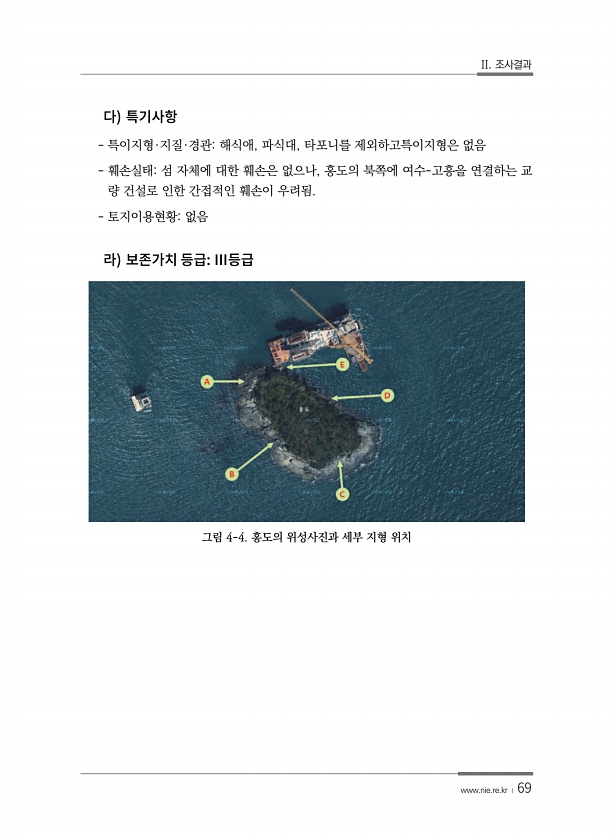 II. 조사결과 www.nie.re.kr ? 69 특이지형·지질·경관해식애, 파식대, 타포니를 제외하고특이지형은 없음 훼손실태섬 자체에 대한 훼손은 없으나, 홍도의 북쪽에 여수-고흥을 연결하는 교 량 건설로 인한 간접적인 훼손이 우려됨. 토지이용현황없음 그림 4-4. 홍도의 위성사진과 세부 지형위치