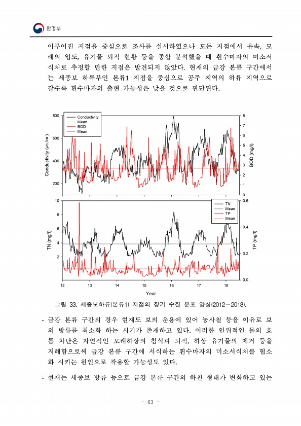 63 이루어진 지점을 중심으로 조사를 실시하였으나 모든 지점에서 유속, 모 래의 입도, 유기물 퇴적 현황 등을 종합 분석했을 때 흰수마자의 미소서 식처로 추정할 만한 지점은 발견되지 않았다. 현재의 금강 본류 구간에서 는 세종보 하류부인 본류1 지점을 중심으로 공주 지역의 하류 지역으로 갈수록 흰수마자의 출현 가능성은 낮을 것으로 판단된다. 그림 33. 세종보하류 본류1 지점의 장기 수질 분포 양상 2012∼2018 금강 본류 구간의 경우 현재도 보의 운용에 있어 농사철 등을 이유로 보 의 방류를 최소화 하는 시기가 존재하고 있다. 이러한 인위적인 물의 흐 름 차단은 자연적인 모래하상의 침식과 퇴적, 하상 유기물의 제거 등을 저해함으로써 금강 본류 구간에 서식하는 흰수마자의 미소서식처를 협소 화 시키는 원인...