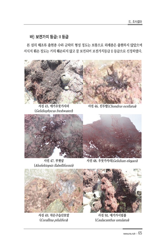 II. 조사결과 www.nie.re.kr ? 65 II 본 섬의 해조류 출현종 수와 군락의 형성 정도는 보통으로 외래종은 출현하지 않았으며 서식지 훼손 정도는 거의 훼손되지 않고 잘 보전되어 보전가치등급 II 등급으로 선정하였다. 사진 45. 애기우뭇가사리 Gelidiophycus freshwateri 사진 46. 진두발 Chondrus ocellatus 사진 47. 부챗살 Ahnfeltiopsis flabelliformis 사진 48. 우뭇가사리 Gelidium elegans 사진 49. 작은구슬산호말 Corallina pilulifera 사진 50. 애기가시덤불 Caulacanthus ustulatus