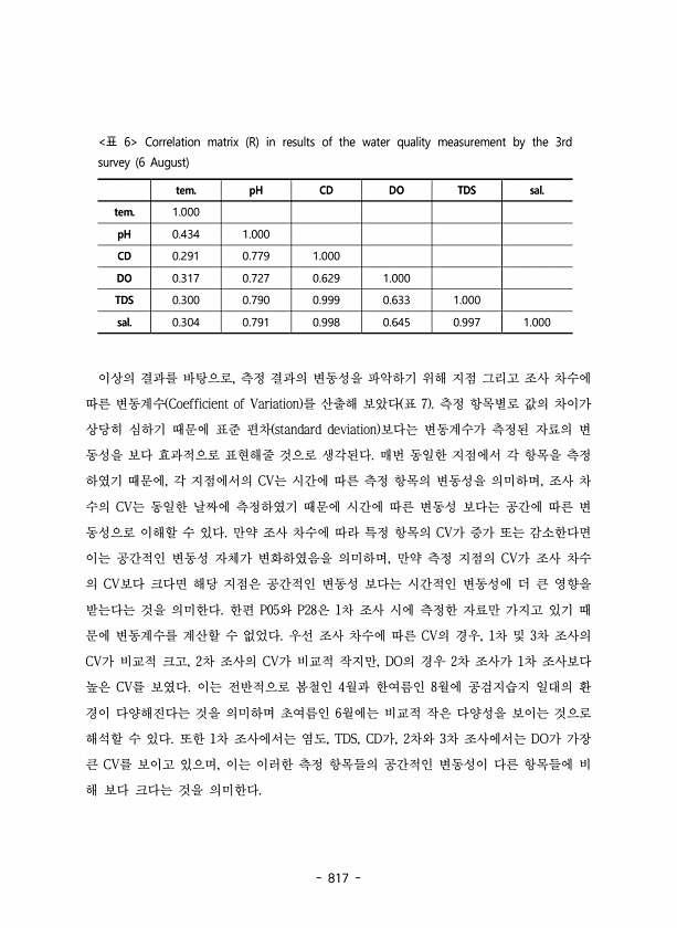 817 tem. pH CD DO TDS sal. tem. 1.000 pH 0.434 1.000 CD 0.291 0.779 1.000 DO 0.317 0.727 0.629 1.000 TDS 0.300 0.790 0.999 0.633 1.000 sal. 0.304 0.791 0.998 0.645 0.997 1.000 표 6 Correlation matrix R in results of the water quality measurement by the 3rd survey 6 August 이상의 결과를 바탕으로, 측정 결과의 변동성을 파악하기 위해 지점 그리고 조사 차수에 따른 변동계수 Coefficient of Variation 를 산출해 보았다 표 7 측정 항목별로 값의 차이가 상당히 심하기 때문에 표준 편차 ...