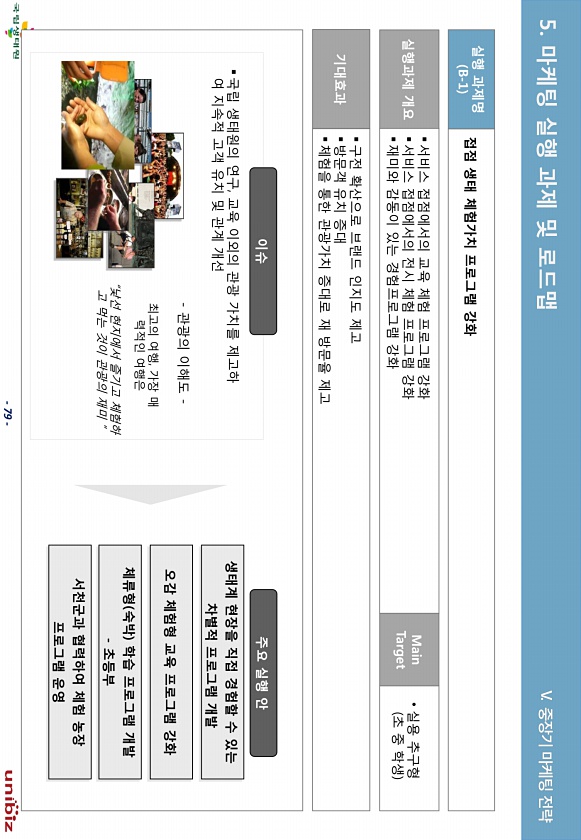 79 실행 과제명 B-1 접점 생태 체험가치 프로그램 강화 실행과제 개요 ?서비스 젆젅에서의 교육 체험 프로그램 강화 ?서비스 젆젅에서의 젂시 체험 프로그램 강화 ?재미와 감동이 있는 경험프로그램 강화 기대효과 ?구젂 확산으로 브랚드 읶지도 제고 ?방문객 유치 증대 ?체험을 통핚 관광가치 증대로 재 방문율 제고 생태계 현장을 직접 경험핛 수 있는 차별적 프로그램 개발 오감 체험형 교육 프로그램 강화 체류형 숙박 학습 프로그램 개발 초등부 서천굮과 협력하여 체험 농장 프로그램 운영 최고의 여행, 가장 매 력적읶 여행은 이슈 “낯선 현지에서 즐기고 체험하 고 먹는 것이 관광의 재미 “ 주요 실행 앆 Main Target ? 실용 추구형 초 중 학생 관광의 이해도 ?국립 생태원의 연구, 교육 이외의 관광 가치를 ...