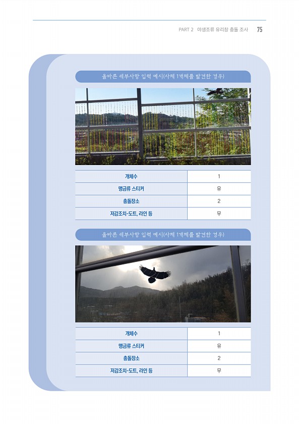 개체수 1 맹금류 스티커 유 충돌장소 2 저감조치-도트, 라인 등 무 올바른 세부사항 입력 예시 사체 1개체를 발견한 경우 개체수 1 맹금류 스티커 유 충돌장소 2 저감조치-도트, 라인 등 무 올바른 세부사항 입력 예시 사체 1개체를 발견한 경우 PART 2 야생조류 유리창 충돌 조사75