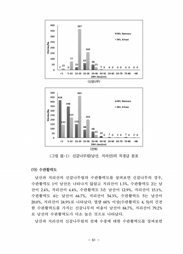 51 신갈나무 전체 그림 Ⅲ-1 신갈나무림 남산, 지리산 의 직경급 분포 다 수관활력도 남산과 지리산의 신갈나무림의 수관활력도를 살펴보면 신갈나무의 경우, 수관활력도 1이 남산은 나타나지 않았고 지리산이 1.3%, 수관활력도 2는 남 산이 2.4%, 지리산이 4.4%, 수관활력도 3은 남산이 12.9%, 지리산이 15.1%, 수관활력도 4는 남산이 64.7%, 지리산이 54.3%, 수관활력도 5는 남산이 20.0%, 지리산이 24.9%로 나타났다. 엽량 60% 이상 수관활력도 4, 5 의 건전 한 수관활력도를 가지는 신갈나무의 비율이 남산이 84.7%, 지리산이 79.2% 로 남산의 수관활력도가 다소 높은 것으로 나타났다. 남산과 지리산의 신갈나무림의 전체 수종에 대한 수관활력도를살펴보면