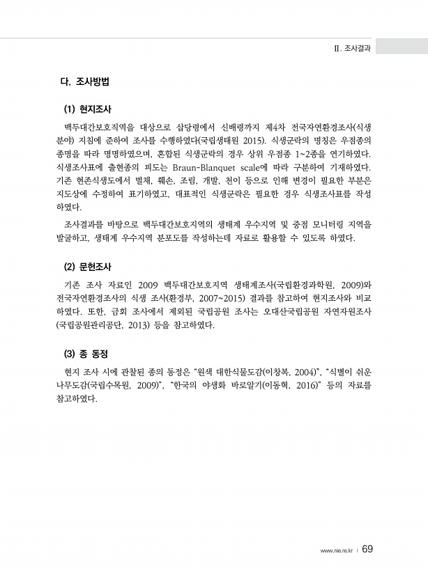 Ⅱ. 조사결과 www.nie.re.kr ? 69 다. 조사방법 1 현지조사 백두대간보호직역을 대상으로 삽당령에서 신배령까지 제4차 전국자연환경조사 식생 분야 지침에 준하여 조사를 수행하였다 국립생태원 2015 식생군락의 명칭은 우점종의 종명을 따라 명명하였으며, 혼합된 식생군락의 경우 상위 우점종 12종을 연기하였다. 식생조사표에 출현종의 피도는 Braun-Blanquet scale에 따라 구분하여 기재하였다. 기존 현존식생도에서 벌채, 훼손, 조림, 개발, 천이 등으로 인해 변경이 필요한 부분은 지도상에 수정하여 표기하였고, 대표적인 식생군락은 필요한 경우 식생조사표를 작성 하였다. 조사결과를 바탕으로 백두대간보호지역의 생태계 우수지역 및 중점 모니터링 지역을 발굴하고, 생태계 우수지역 분포도를 작성하는데...