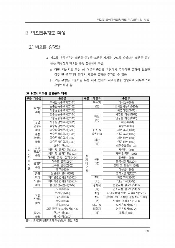 제2장 도시생태현황지도 작성원칙 및 방법 69 비오톱유형도 작성 3.1 비오톱 유형화 ¡ 비오톱 유형분류는 대분류-중분류-소분류 체계를 갖도록 작성하며 대분류-중분 류는 지침상의 비오톱 유형 분류체계 따름 ▷ 다만, 대상지의 특성 상 대분류-중분류 유형에서 추가적인 유형이 필요한 경우 현 분류체계 안에서 새로운 유형을 추가할 수 있음 ▷ 모든 유형은 표준화된 유형 체계 안에서 지역특성을 반영하여 세부적으로 유형화해야 함 구분 대분류 중분류 구분 대분류 중분류 시가지비오톱 주거지 01 도시단독주택지 0101 특수지 08 야적장 0803 농촌단독주택지 0102 조사불가능지 0804 저층공동주택지 0103 녹지비오톱 하천 09 자연하천 0901 중층공동주택지 0104 자연형 하천 0902 고층공동주택지 0105 ...