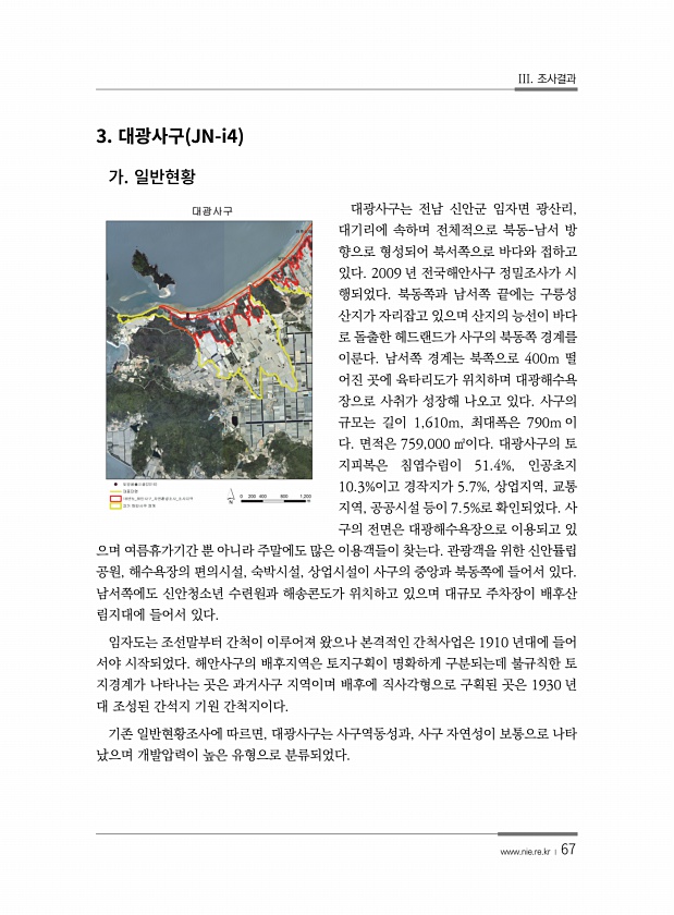 III. 조사결과 www.nie.re.kr ? 67 3. JN-i4 대광사구는 전남 신안군 임자면 광산리, 대기리에 속하며 전체적으로 북동-남서 방 향으로 형성되어 북서쪽으로 바다와 접하고 있다. 2009 년 전국해안사구 정밀조사가 시 행되었다. 북동쪽과 남서쪽 끝에는 구릉성 산지가 자리잡고 있으며 산지의 능선이 바다 로 돌출한 헤드랜드가 사구의 북동쪽 경계를 이룬다. 남서쪽 경계는 북쪽으로 400m 떨 어진 곳에 육타리도가 위치하며 대광해수욕 장으로 사취가 성장해 나오고 있다. 사구의 규모는 길이 1,610m, 최대폭은 790m 이 다. 면적은 759,000 ㎡이다. 대광사구의 토 지피복은 침엽수림이 51.4%, 인공초지 10.3%이고 경작지가 5.7%, 상업지역, 교통 지역, 공공시설 등이 7.5%로 확...
