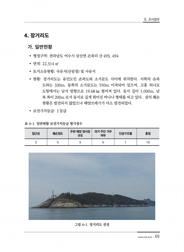 II. 조사결과 www.nie.re.kr ? 69 4. ? 행정구역전라남도 여수시 삼산면 손죽리 산 493, 494 ? 면적22,314 ㎡ ? 토지소유현황국유지 산림청 및 사유지 ? 현황장거리도는 유인도인 손죽도와 소거문도 사이에 위치한다. 서쪽의 손죽 도와는 330m, 동쪽의 소거문도는 550m 이격되어 있으며, 고흥 외나로 도항에서는 남서 방향으로 19.68 ㎞ 떨어져 있다. 동서 길이 1,000m, 남 북 폭이 200m 로서 동서로 길게 휘어진 바나나 형태를 띠고 있다. 섬의 훼손 현황은 발견되지 않았으나 해양쓰레기가 다소 발견되었다. ? 보전가치등급Ⅰ등급 접근성 훼손정도 주변 해양 양식장 규모 과거 주민 거주 여부 인공구조물 총점 3 5 5 5 1 19 표 4-1. 일반현황 보전가치등급 평가점수 그림...