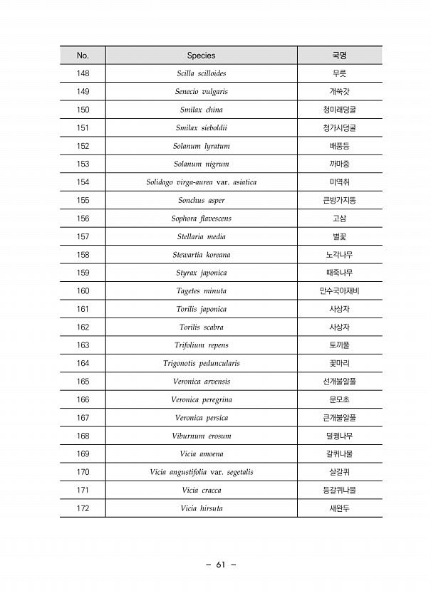61 No. Species 국명 148 Scilla scilloides 무릇 149 Senecio vulgaris 개쑥갓 150 Smilax china 청미래덩굴 151 Smilax sieboldii 청가시덩굴 152 Solanum lyratum 배풍등 153 Solanum nigrum 까마중 154 Solidago virga-aurea var. asiatica 미역취 155 Sonchus asper 큰방가지똥 156 Sophora flavescens 고삼 157 Stellaria media 별꽃 158 Stewartia koreana 노각나무 159 Styrax japonica 때죽나무 160 Tagetes minuta 만수국아재비 161 Torilis japonica 사상자 162 Torilis scab...