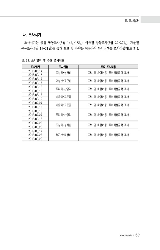 Ⅱ. 조사결과 www.nie.re.kr ? 69 나. 조사시기 조사시기는 봄철 합동조사 5월 14일-18일 , 여름철 공동조사 7월 22-27일 , 가을철 공동조사 9월 16-21일 를 통해 도보 및 차량을 이용하여 특이식생을 조사하였다 표 21 조사일자 조사지점 주요 조사내용 2018.05.14 도창리-성재산 도보 및 차량이동, 특이식생군락 조사 2018.09.17 2018.05.14 대성산-적근산 도보 및 차량이동, 특이식생군락 조사 2018.09.17 2018.05.18 주파리-산양리 도보 및 차량이동, 특이식생군락 조사 2018.09.19 2018.05.15 비운이-고둔골 도보 및 차량이동, 특이식생군락 조사 2018.09.19 2018.07.24 비운이-고둔골 도보 및 차량이동, 특이식생군락 조사 ...