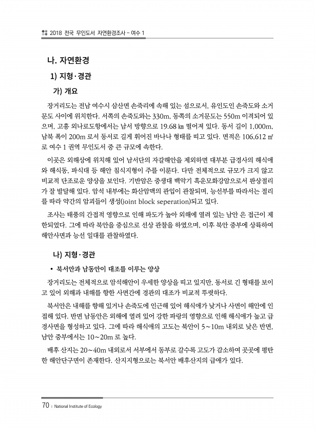 2018 전국 무인도서 자연환경조사 여수 1 70 ? National Institute of Ecology 1 · 장거리도는 전남 여수시 삼산면 손죽리에 속해 있는 섬으로서, 유인도인 손죽도와 소거 문도 사이에 위치한다. 서쪽의 손죽도와는 330m, 동쪽의 소거문도는 550m 이격되어 있 으며, 고흥 외나로도항에서는 남서 방향으로 19.68 ㎞ 떨어져 있다. 동서 길이 1,000m, 남북 폭이 200m 로서 동서로 길게 휘어진 바나나 형태를 띠고 있다. 면적은 106,612 ㎡ 로 여수 1 권역 무인도서 중 큰 규모에 속한다. 이곳은 외해상에 위치해 있어 남서단의 자갈해안을 제외하면 대부분 급경사의 해식애 와 해식동, 파식대 등 해안 침식지형이 주를 이룬다. 다만 전체적으로 규모가 크지 않고 비교적 단조로운...