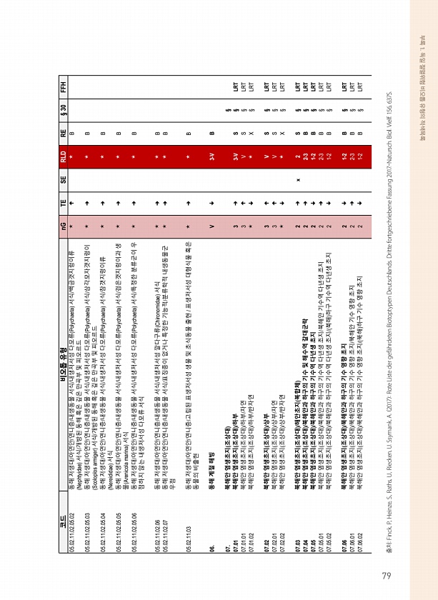 부록 1. 독일 절멸위험 비오톱 유형의 적색목록 출처Finck, P., Heinze, S., Raths, U., Riecken, U. Ssymank, A. 2017 Rote Liste der gef?hrdeten Biotoptypen Deutschlands. Dritte fortgeschriebene Fassung 2017.-Natursch. Biol. Vielf. 156, 637S. 코드 비오톱 유형 nG TE SE RLD RE § 30 FFH 05.02.11.02.05.02 동해 저생대/아연안/연니층/내생동물 서식/내생저서성 다모류 Polychaeta 서식/백금갯지렁이류 Nephtyidae 서식/개방된 동해 혹은 깊은 만곡부 및 피오르드 ? ? ? B 05.02.11.02.05.03 동해 저생대/아연안/...