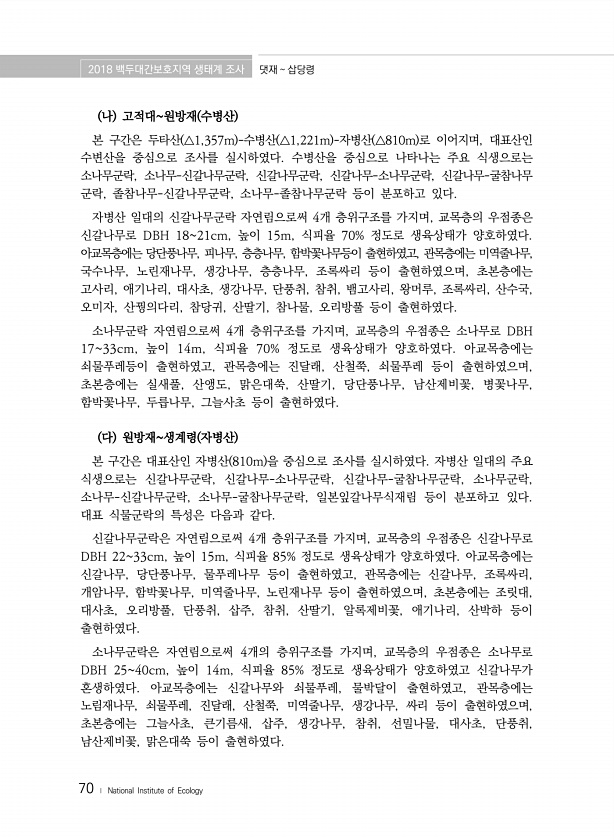 2018 백두대간보호지역 생태계 조사 댓재 삽당령 70 ? National Institute of Ecology 나 고적대원방재 수병산 본 구간은 두타산 △1,357m -수병산 △1,221m -자병산 △810m 로 이어지며, 대표산인 수변산을 중심으로 조사를 실시하였다. 수병산을 중심으로 나타나는 주요 식생으로는 소나무군락, 소나무-신갈나무군락, 신갈나무군락, 신갈나무-소나무군락, 신갈나무-굴참나무 군락, 졸참나무-신갈나무군락, 소나무-졸참나무군락 등이 분포하고 있다. 자병산 일대의 신갈나무군락 자연림으로써 4개 층위구조를 가지며, 교목층의 우점종은 신갈나무로 DBH 1821cm, 높이 15m, 식피율 70% 정도로 생육상태가 양호하였다. 아교목층에는 당단풍나무, 피나무, 층층나무, 함박꽃나무등이 출현하였고...