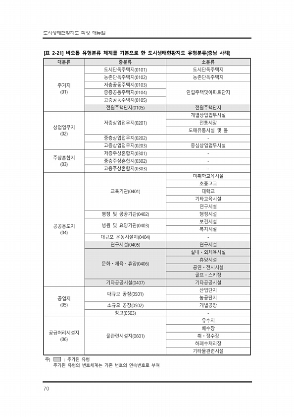 도시생태현황지도 작성 매뉴얼 70 대분류 중분류 소분류 주거지 01 도시단독주택지 0101 도시단독주택지 농촌단독주택지 0102 농촌단독주택지 저층공동주택지 0103 중층공동주택지 0104 연립주택및아파트단지 고층공동주택지 0105 전원주택단지 0105 전원주택단지 상업업무지 02 저층상업업무지 0201 개별상업업무시설 전통시장 도매유통시설 및 몰 중층상업업무지 0202 고층상업업무지 0203 중심상업업무시설 주상혼합지 03 저층주상혼합지 0301 중층주상혼합지 0302 고층주상혼합지 0303 공공용도지 04 교육기관 0401 미취학교육시설 초중고교 대학교 기타교육시설 연구시설 행정 및 공공기관 0402 행정시설 병원 및 요양기관 0403 보건시설 복지시설 대규모 운동시설지 0404 연구시설 0405 연구시...