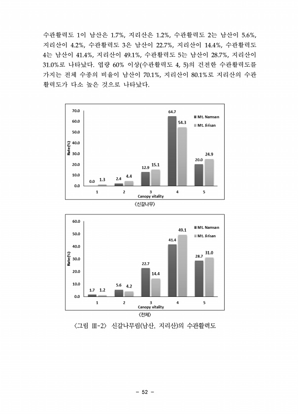 52 수관활력도 1이 남산은 1.7%, 지리산은 1.2%, 수관활력도 2는 남산이 5.6%, 지리산이 4.2%, 수관활력도 3은 남산이 22.7%, 지리산이 14.4%, 수관활력도 4는 남산이 41.4%, 지리산이 49.1%, 수관활력도 5는 남산이 28.7%, 지리산이 31.0%로 나타났다. 엽량 60% 이상 수관활력도 4, 5 의 건전한 수관활력도를 가지는 전체 수종의 비율이 남산이 70.1%, 지리산이 80.1%로 지리산의 수관 활력도가 다소 높은 것으로 나타났다. 신갈나무 전체 그림 Ⅲ-2 신갈나무림 남산, 지리산 의수관활력도