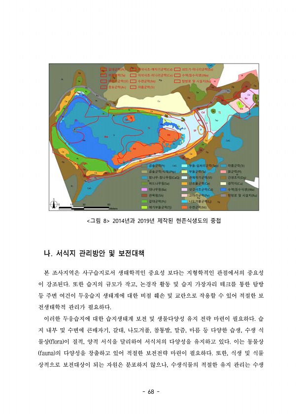 68 그림 8 2014년과 2019년 제작된 현존식생도의 중첩 나. 서식지 관리방안 및 보전대책 본 조사지역은 사구습지로서 생태학적인 중요성 보다는 지형학적인 관점에서의 중요성 이 강조된다. 또한 습지의 규모가 작고, 논경작 활동 및 습지 가장자리 테크를 통한 탐방 등 주변 여건이 두웅습지 생태계에 대한 비점 훼손 및 교란으로 작용할 수 있어 적절한 보 전생태학적 관리가 필요하다. 이러한 두웅습지에 대한 습지생태계 보전 및 생물다양성 유지 전략 마련이 필요하다. 습 지 내부 및 수변에 큰매자기, 갈대, 나도겨풀, 참통발, 말즘, 마름 등 다양한 습생, 수생 식 물상 flora 이 질적, 양적 서식을 달리하여 서식처의 다양성을 유지하고 있다. 이는 동물상 fauna 의 다양성을 창출하고 있어 적절한 보전전략 ...