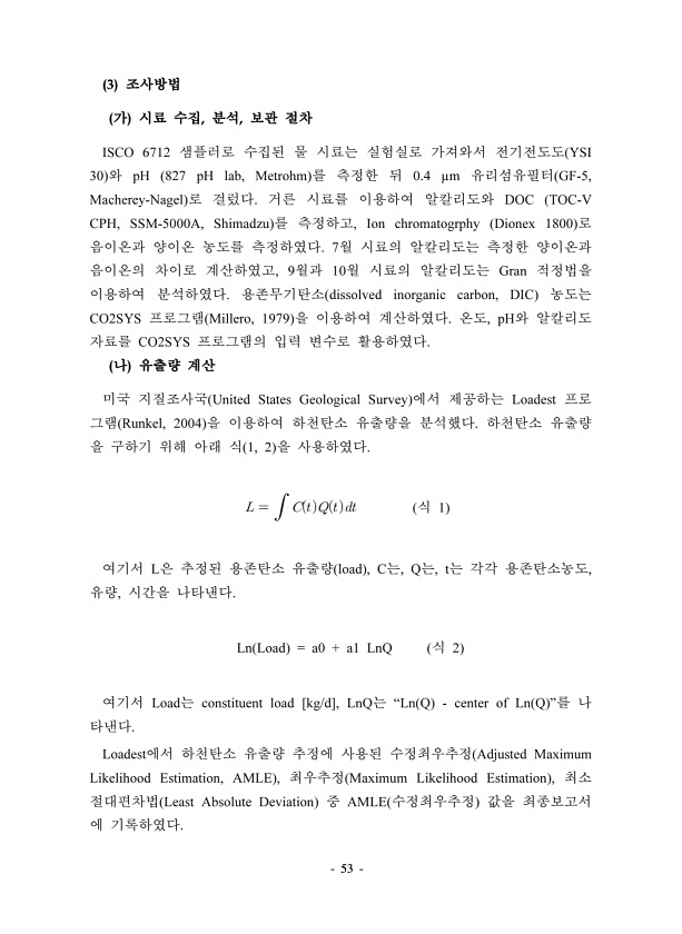 53 3 , , ISCO 6712 YSI 30 pH 827 pH lab, Metrohm 0.4 ?m GF-5, Macherey-Nagel DOC TOC-V CPH, SSM-5000A, Shimadzu , Ion chromatogrphy Dionex 1800 7 , 9 10 Gran dissolved inorganic carbon, DIC CO2SYS Millero, 1979 , pH CO2SYS United States Geological Survey Loadest Runkel, 2004 1, 2 1 L load , C , Q , t , , Ln Load = a0 + a1 LnQ 2 Load constituent load [kg/d], LnQ “Ln Q center of Ln Q ” Loadest Adjus...