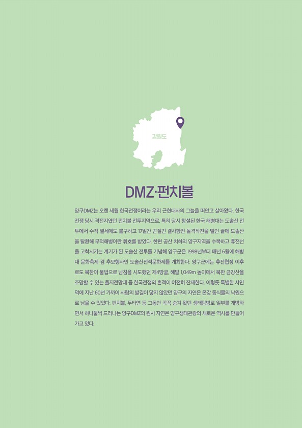 077 양구 DDDDDDD DM·펀치볼 양구DMZ는 오랜 세월 한국전쟁이라는 우리 근현대사의 그늘을 떠안고 살아왔다. 한국 전쟁 당시 격전지였던 펀치볼 전투지역으로, 특히 당시 창설된 한국 해병대는 도솔산 전 투에서 수적 열세에도 불구하고 17일간 끈질긴 결사항전 돌격작전을 벌인 끝에 도솔산 을 탈환해 무적해병이란 휘호를 받았다. 한편 공산 치하의 양구지역을 수복하고 휴전선 을 고착시키는 계기가 된 도솔산 전투를 기념해 양구군은 1998년부터 매년 6월에 해병 대 문화축제 겸 추모행사인 도솔산전적문화제를 개최한다. 양구군에는 휴전협정 이후 로도 북한이 불법으로 남침을 시도했던 제4땅굴, 해발 1,049m 높이에서 북한 금강산을 조망할 수 있는 을지전망대 등 한국전쟁의 흔적이 여전히 잔재한다. 이렇듯 특별한 ...