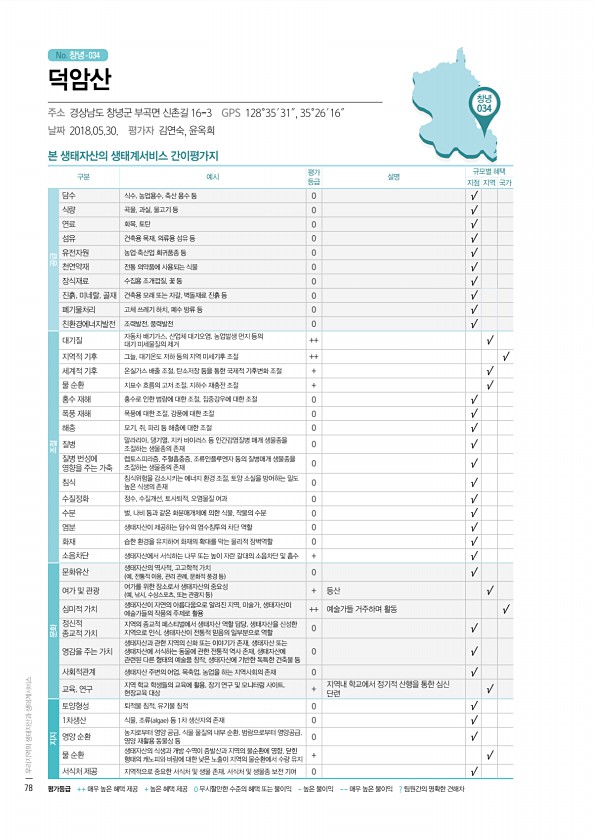 No. 창녕- 창녕 034 본 생태자산의 생태계서비스 간이평가지 구분 예시 평가 등급 설명 규모별 혜택 지점 지역 국가 공급 담수 식수, 농업용수, 축산 용수 등 0 √ 식량 곡물, 과실, 물고기 등 0 √ 연료 화목, 토탄 0 √ 섬유 건축용 목재, 의류용 섬유 등 0 √ 유전자원 농업·축산업 희귀품종 등 0 √ 천연약재 전통 의약품에 사용되는 식물 0 √ 장식재료 수집용 조개껍질, 꽃 등 0 √ 진흙, 미네랄, 골재 건축용 모래 또는 자갈, 벽돌재료 진흙 등 0 √ 폐기물처리 고체 쓰레기 하치, 폐수 방류 등 0 √ 친환경에너지발전 조력발전, 풍력발전 0 √ 조절 대기질 자동차 배기가스, 산업체 대기오염, 농업발생 먼지 등의 대기 미세물질의 제거 ++ √ 지역적 기후 그늘, 대기온도 저하 등의 지역 미세...