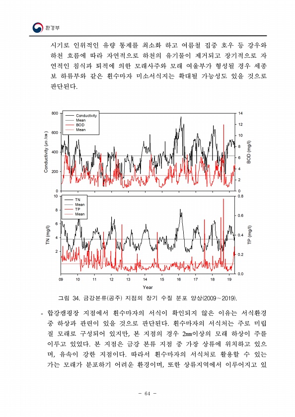 64 시기로 인위적인 유량 통제를 최소화 하고 여름철 집중 호우 등 강우와 하천 흐름에 따라 자연적으로 하천의 유기물이 제거되고 장기적으로 자 연적인 침식과 퇴적에 의한 모래사주와 모래 여울부가 형성될 경우 세종 보 하류부와 같은 흰수마자 미소서식지는 확대될 가능성도 있을 것으로 판단된다. 그림 34. 금강본류 공주 지점의 장기 수질 분포 양상 2009∼2019 합강캠핑장 지점에서 흰수마자의 서식이 확인되지 않은 이유는 서식환경 중 하상과 관련이 있을 것으로 판단된다. 흰수마자의 서식처는 주로 미립 질 모래로 구성되어 있지만, 본 지점의 경우 2㎜이상의 모래 하상이 주를 이루고 있었다. 본 지점은 금강 본류 지점 중 가장 상류에 위치하고 있으 며, 유속이 강한 지점이다. 따라서 흰수마자의 서식처로 활용할 수...