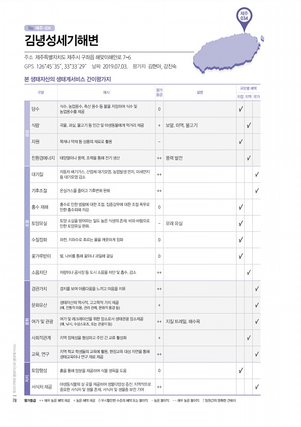 No. 제주- 제주 034 본 생태자산의 생태계서비스 간이평가지 구분 예시 평가 등급 설명 규모별 혜택 지점 지역 국가 공급 담수 식수, 농업용수, 축산 용수 등 물을 저장하여 식수 및 농업용수를 제공 0 √ 식량 곡물, 과실, 물고기 등 인간 및 야생동물에게 먹거리 제공 + 보말, 미역, 물고기 √ 자원 목재나 약재 등 상품의 재료로 활용 √ 친환경에너지 태양열이나 풍력, 조력을 통해 전기 생산 ++ 풍력 발전 √ 조절 대기질 자동차 배기가스, 산업체 대기오염, 농업발생 먼지, 미세먼지 등 대기오염 감소 ++ √ 기후조절 온실가스를 줄이고 기후변화 완화 ++ √ 홍수 재해 홍수로 인한 범람에 대한 조절, 집중강우에 대한 조절 폭우로 인한 홍수피해 저감 0 √ 토양유실 토양 소실을 방어하는 밀도 높은 식생의...