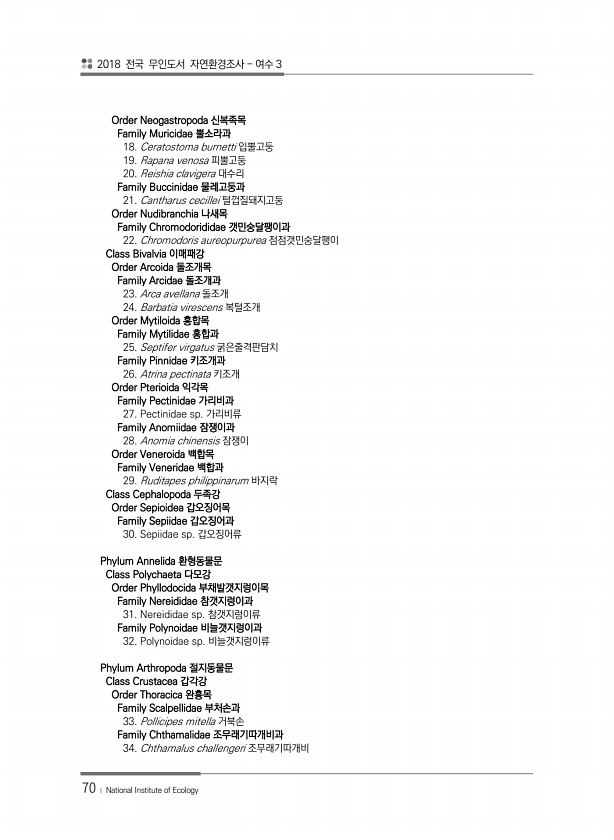 2018 전국 무인도서 자연환경조사 여수 3 70 ? National Institute of Ecology Order Neogastropoda 신복족목 Family Muricidae 뿔소라과 18. Ceratostoma burnetti 입뿔고둥 19. Rapana venosa 피뿔고둥 20. Reishia clavigera 대수리 Family Buccinidae 물레고둥과 21. Cantharus cecillei 털껍질돼지고둥 Order Nudibranchia 나새목 Family Chromodorididae 갯민숭달팽이과 22. Chromodoris aureopurpurea 점점갯민숭달팽이 Class Bivalvia 이매패강 Order Arcoida 돌조개목 Family Arcidae 돌조개과 23. Arc...