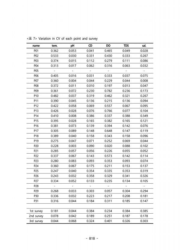 818 name tem. pH CD DO TDS sal. P01 0.362 0.053 0.041 0.465 0.049 0.028 P02 0.533 0.030 0.331 0.430 0.333 0.267 P03 0.374 0.015 0.112 0.279 0.111 0.086 P04 0.313 0.017 0.062 0.316 0.063 0.032 P05 P06 0.405 0.016 0.031 0.333 0.037 0.075 P07 0.360 0.004 0.044 0.229 0.044 0.008 P08 0.372 0.011 0.010 0.197 0.013 0.047 P09 0.361 0.072 0.230 0.782 0.236 0.173 P10 0.482 0.037 0.319 0.462 0.321 0.267 P11 ...