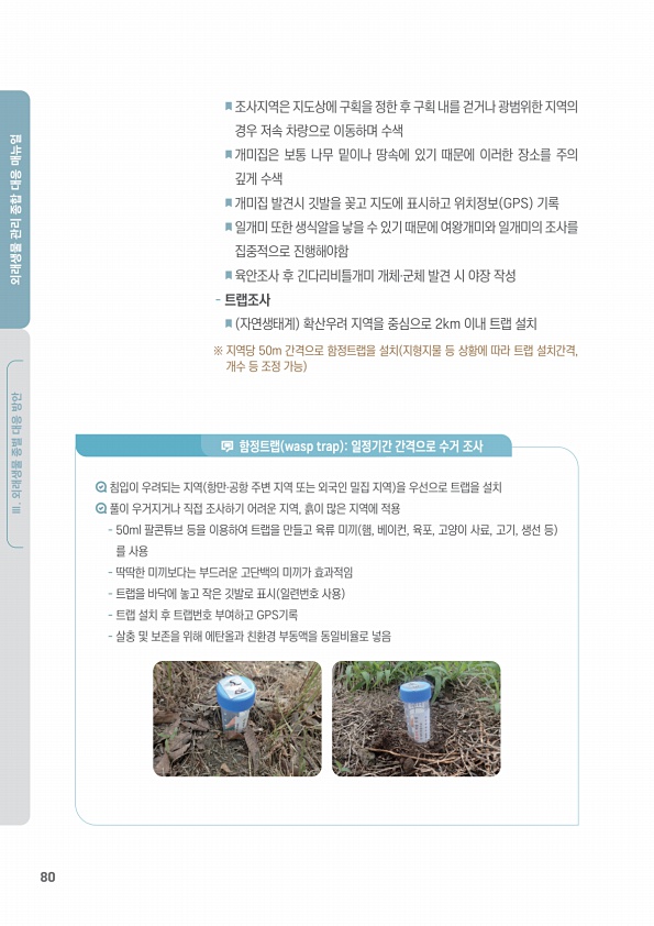 80 Ⅲ. 외래생물 종별 대응 방안 외래생물 관리 종합 대응 매뉴얼 조사지역은 지도상에 구획을 정한 후 구획 내를 걷거나 광범위한 지역의 경우 저속 차량으로 이동하며 수색 개미집은 보통 나무 밑이나 땅속에 있기 때문에 이러한 장소를 주의 깊게 수색 개미집 발견시 깃발을 꽂고 지도에 표시하고 위치정보 GPS 기록 일개미 또한 생식알을 낳을 수 있기 때문에 여왕개미와 일개미의 조사를 집중적으로 진행해야함 육안조사 후 긴다리비틀개미 개체·군체 발견 시 야장 작성 트랩조사 자연생태계 확산우려 지역을 중심으로 2km 이내 트랩 설치 ※ 지역당 50m 간격으로 함정트랩을 설치 지형지물 등 상황에 따라 트랩 설치간격, 개수 등 조정 가능 침입이 우려되는 지역 항만·공항 주변 지역 또는 외국인 밀집 지역 을 우선으로 트랩...