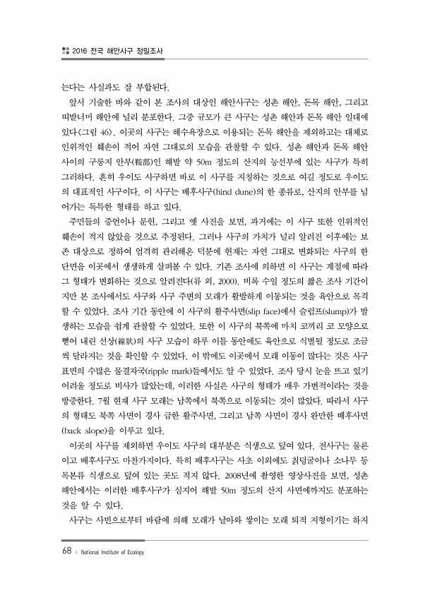 2016 전국 해안사구 정밀조사 68 ? National Institute of Ecology 는다는 사실과도 잘 부합된다. 앞서 기술한 바와 같이 본 조사의 대상인 해안사구는 성촌 해안, 돈목 해안, 그리고 띠밭너머 해안에 널리 분포한다. 그중 규모가 큰 사구는 성촌 해안과 돈목 해안 일대에 있다 그림 46 이곳의 사구는 해수욕장으로 이용되는 돈목 해안을 제외하고는 대체로 인위적인 훼손이 적어 자연 그대로의 모습을 관찰할 수 있다. 성촌 해안과 돈목 해안 사이의 구릉지 안부 鞍部 인 해발 약 50m 정도의 산지의 능선부에 있는 사구가 특히 그러하다. 흔히 우이도 사구하면 바로 이 사구를 지칭하는 것으로 여길 정도로 우이도 의 대표적인 사구이다. 이 사구는 배후사구 hind dune 의 한 종류로, 산지의 ...