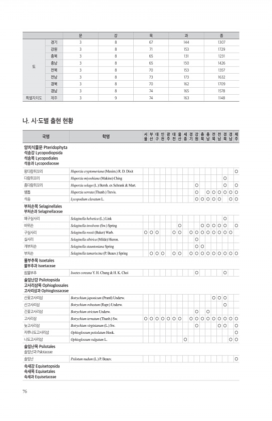 76 도 경기 3 8 67 144 1307 강원 3 8 71 153 1729 충북 3 8 65 131 1231 충남 3 8 65 150 1426 전북 3 8 70 153 1357 전남 3 8 73 173 1632 경북 3 8 70 162 1709 경남 3 8 74 165 1578 특별자치도 제주 3 9 74 163 1148 나. 시·도별 출현 현황 국명 학명 서 울 부산 대구 인천 광주 대전 울산 세종 경기 강원 충북 충남 전북 전남 경북 경남 제주 양치식물문 Pteridophyta 석송강 Lycopodiopsida 석송목 Lycopodiales 석송과 Lycopodiaceae 왕다람쥐꼬리 Huperzia cryptomeriana Maxim. R. D. Dixit ○ 다람쥐꼬리 Huperzia miyoshi...