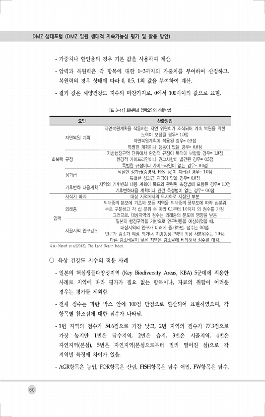 60 DMZ 생태포럼 DMZ 일원 생태적 지속가능성 평가 및 활용 방안 가중치나 할인율의 경우 기본 값을 사용하여 계산. 압력과 복원력은 각 항목에 대한 13까지의 가중치를 부여하여 산정하고, 복원력의 경우 상태에 따라 0, 0.5, 1의 값을 부여하여 계산. 결과 값은 해양건강도 지수와 마찬가지로, 0에서 100사이의 값으로 표현. 요인 산출방법 회복력 자연복원 계획 자연복원계획을 적용하는 자연 위원회가 조직되어 계속 복원을 위한 노력이 보장될 경우= 1.0점 자연복원계획이 적용된 경우= 0.5점 특별한 계획이나 행동이 없을 경우= 0.0점 규정 지방행정구역 단위에서 환경적 규정이 목적에 부합할 경우= 1.0점 환경적 가이드라인이나 권고사항이 발간된 경우= 0.5점 특별한 규정이나 가이드라인이 없는 경우=...