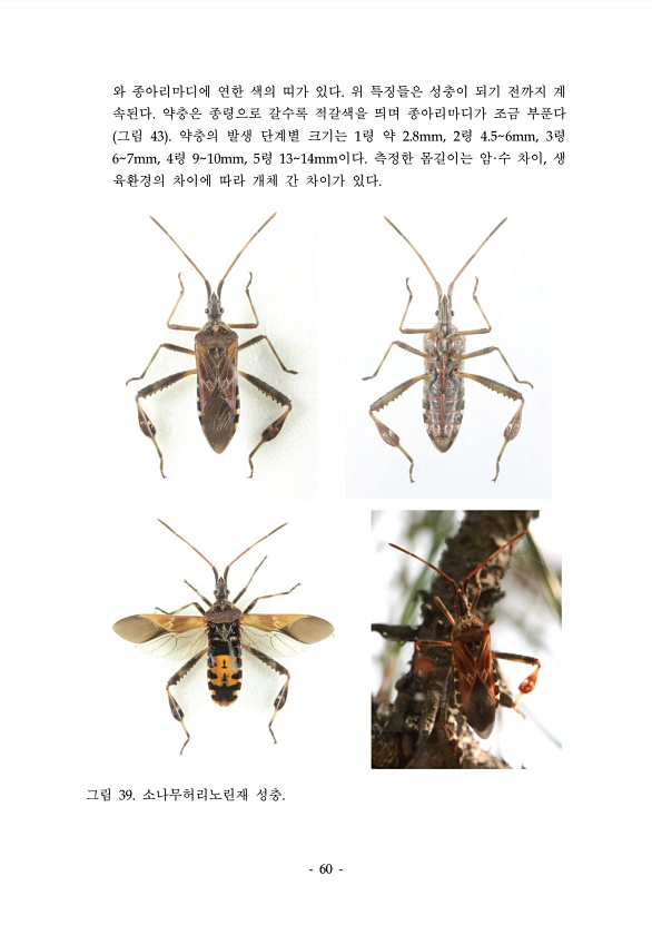60 와 종아리마디에 연한 색의 띠가 있다. 위 특징들은 성충이 되기 전까지 계 속된다. 약충은 종령으로 갈수록 적갈색을 띄며 종아리마디가 조금 부푼다 그림 43 약충의 발생 단계별 크기는 1령 약 2.8mm, 2령 4.56mm, 3령 67mm, 4령 910mm, 5령 1314mm이다. 측정한 몸길이는 암·수 차이, 생 육환경의 차이에 따라 개체 간 차이가 있다. 그림 39. 소나무허리노린재성충.