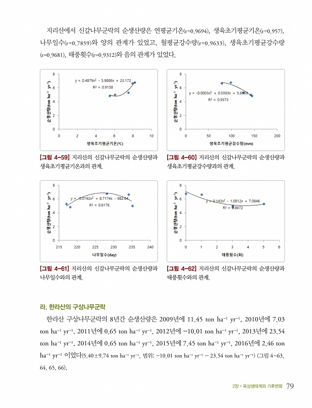 2장 육상생태계와 기후변화 79 지리산에서 신갈나무군락의 순생산량은 연평균기온 r=0.9694 , 생육초기평균기온 r=0.957 , 나무일수 r=0.7859 와 양의 관계가 있었고, 월평균강수량 r=0.9633 , 생육초기평균강수량 r =0.9681 , 태풍횟수 r=0.9312 와 음의 관계가 있었다. [그림 4-59] 지리산의 신갈나무군락의 순생산량과 생육초기평균기온과의 관계. [그림 4-60] 지리산의 신갈나무군락의 순생산량과 생육초기평균강수량과의 관계. [그림 4-61] 지리산의 신갈나무군락의 순생산량과 나무일수와의 관계. [그림 4-62] 지리산의 신갈나무군락의 순생산량과 태풍횟수와의 관계. 라. 한라산의 구상나무군락 한라산 구상나무군락의 8년간 순생산량은 2009년에 11.45 ton ha-1 yr...