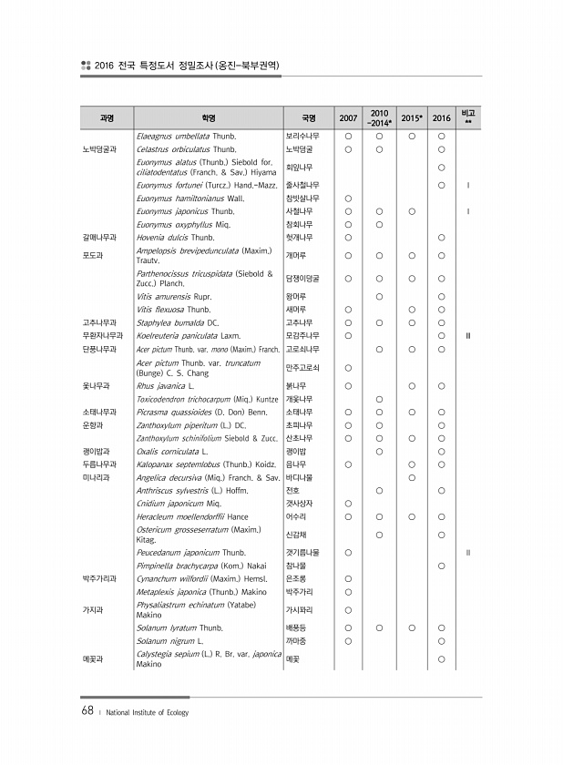 2016 전국 특정도서 정밀조사 옹진-북부권역 68 ? National Institute of Ecology 과명 학명 국명 2007 2010 -2014* 2015* 2016 비고 ** Elaeagnus umbellata Thunb. 보리수나무 ○ ○ ○ ○ 노박덩굴과 Celastrus orbiculatus Thunb. 노박덩굴 ○ ○ ○ Euonymus alatus Thunb. Siebold for. ciliatodentatus Franch. & Sav. Hiyama 회잎나무 ○ Euonymus fortunei Turcz. Hand.-Mazz. 줄사철나무 ○ Ⅰ Euonymus hamiltonianus Wall. 참빗살나무 ○ Euonymus japonicus Thunb. 사철나무 ○ ○ ○ Ⅰ Euony...