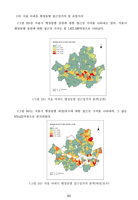 63 사 서울 아파트 행정동별 접근성가치 및 조망가치 그림 33 은 서울시 행정동별 공원에 대한 접근성 가치를 나타내고 있다. 서울시 행정동별 공원에 대한 접근성 가치는 총 1,657,180억원으로 나타났다. 그림 33 서울 아파트 행정동별 접근성가치 총액 공원 그림 34 는 서울시 행정동별 하천/호수에 대한 접근성 가치를 나타내며, 그 값은 674,431억원으로 분석되었다. 그림 34 서울 아파트 행정동별 접근성가치 총액 하천/호수