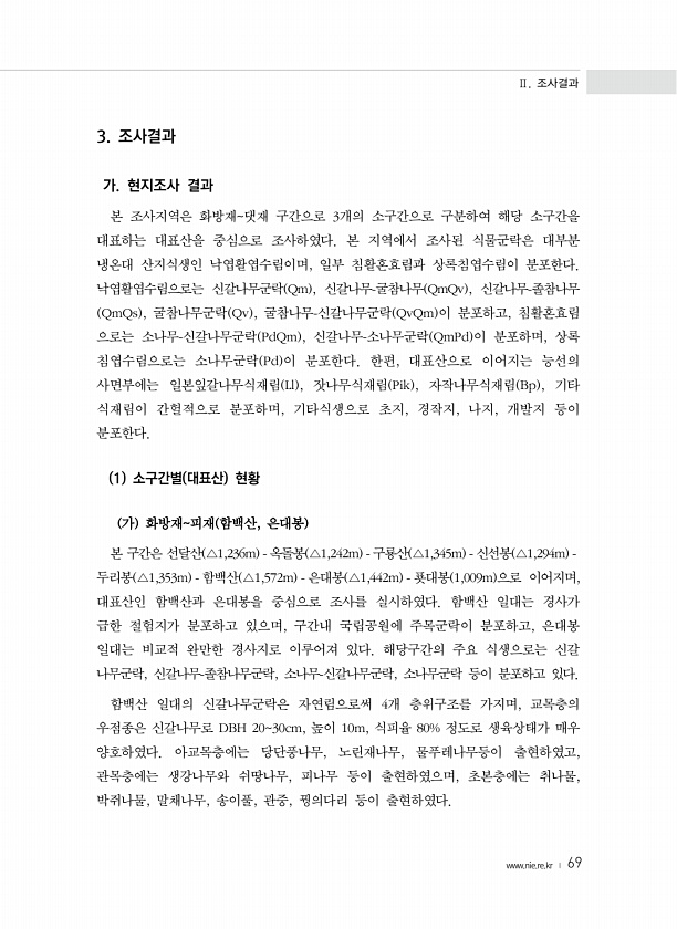 Ⅱ. 조사결과 www.nie.re.kr ? 69 3. 조사결과 가. 현지조사 결과 본 조사지역은 화방재댓재 구간으로 3개의 소구간으로 구분하여 해당 소구간을 대표하는 대표산을 중심으로 조사하였다. 본 지역에서 조사된 식물군락은 대부분 냉온대 산지식생인 낙엽활엽수림이며, 일부 침활혼효림과 상록침엽수림이 분포한다. 낙엽활엽수림으로는 신갈나무군락 Qm , 신갈나무-굴참나무 QmQv , 신갈나무-졸참나무 QmQs , 굴참나무군락 Qv , 굴참나무-신갈나무군락 QvQm 이 분포하고, 침활혼효림 으로는 소나무-신갈나무군락 PdQm , 신갈나무-소나무군락 QmPd 이 분포하며, 상록 침엽수림으로는 소나무군락 Pd 이 분포한다. 한편, 대표산으로 이어지는 능선의 사면부에는 일본잎갈나무식재림 Ll , 잣나무식재림 Pik ,...