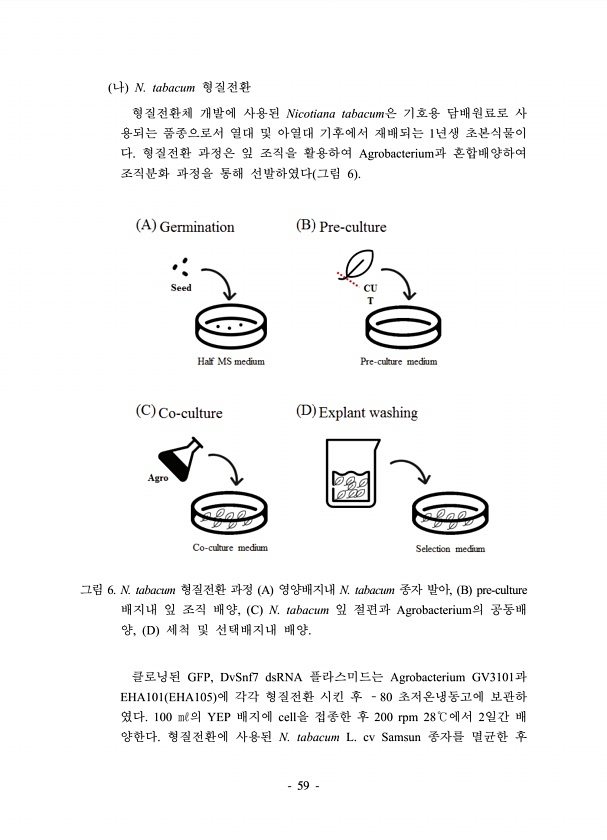 59 나 N. tabacum 형질전환 형질전환체 개발에 사용된 Nicotiana tabacum은 기호용 담배원료로 사 용되는 품종으로서 열대 및 아열대 기후에서 재배되는 1년생 초본식물이 다. 형질전환 과정은 잎 조직을 활용하여 Agrobacterium과 혼합배양하여 조직분화 과정을 통해 선발하였다 그림 6 그림 6. N. tabacum 형질전환 과정 A 영양배지내 N. tabacum 종자 발아, B pre-culture 배지내 잎 조직 배양, C N. tabacum 잎 절편과 Agrobacterium의 공동배 양, D 세척 및 선택배지내 배양. 클로닝된 GFP, DvSnf7 dsRNA 플라스미드는 Agrobacterium GV3101과 EHA101 EHA105 에 각각 형질전환 시킨 후 ?80 초저온냉동고...