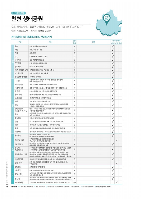 No. 수원- 수원 034 본 생태자산의 생태계서비스 간이평가지 구분 예시 평가 등급 설명 규모별 혜택 지점 지역 국가 공급 담수 식수, 농업용수, 축산 용수 등 + √ 식량 곡물, 과실, 물고기 등 0 √ 연료 화목, 토탄 0 √ 섬유 건축용 목재, 의류용 섬유 등 0 √ 유전자원 농업·축산업 희귀품종 등 0 √ 천연약재 전통 의약품에 사용되는 식물 0 √ 장식재료 수집용 조개껍질, 꽃 등 0 √ 진흙, 미네랄, 골재 건축용 모래 또는 자갈, 벽돌재료 진흙 등 0 √ 폐기물처리 고체 쓰레기 하치, 폐수 방류 등 0 √ 친환경에너지발전 조력발전, 풍력발전 0 √ 조절 대기질 자동차 배기가스, 산업체 대기오염, 농업발생 먼지 등의 대기 미세물질의 제거 + √ 지역적 기후 그늘, 대기온도 저하 등의 지역 미세기...