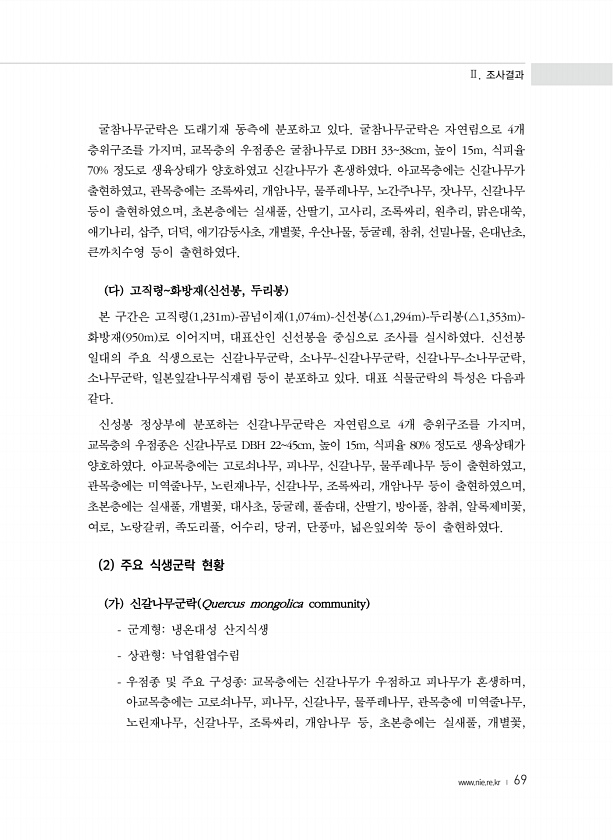 Ⅱ. 조사결과 www.nie.re.kr ? 69 굴참나무군락은 도래기재 동측에 분포하고 있다. 굴참나무군락은 자연림으로 4개 층위구조를 가지며, 교목층의 우점종은 굴참나무로 DBH 3338cm, 높이 15m, 식피율 70% 정도로 생육상태가 양호하였고 신갈나무가 혼생하였다. 아교목층에는 신갈나무가 출현하였고, 관목층에는 조록싸리, 개암나무, 물푸레나무, 노간주나무, 잣나무, 신갈나무 등이 출현하였으며, 초본층에는 실새풀, 산딸기, 고사리, 조록싸리, 원추리, 맑은대쑥, 애기나리, 삽주, 더덕, 애기감둥사초, 개별꽃, 우산나물, 둥굴레, 참취, 선밀나물, 은대난초, 큰까치수영 등이 출현하였다. 다 고직령화방재 신선봉, 두리봉 본 구간은 고직령 1,231m -곰넘이재 1,074m -신선봉 △1,294m -두리봉...