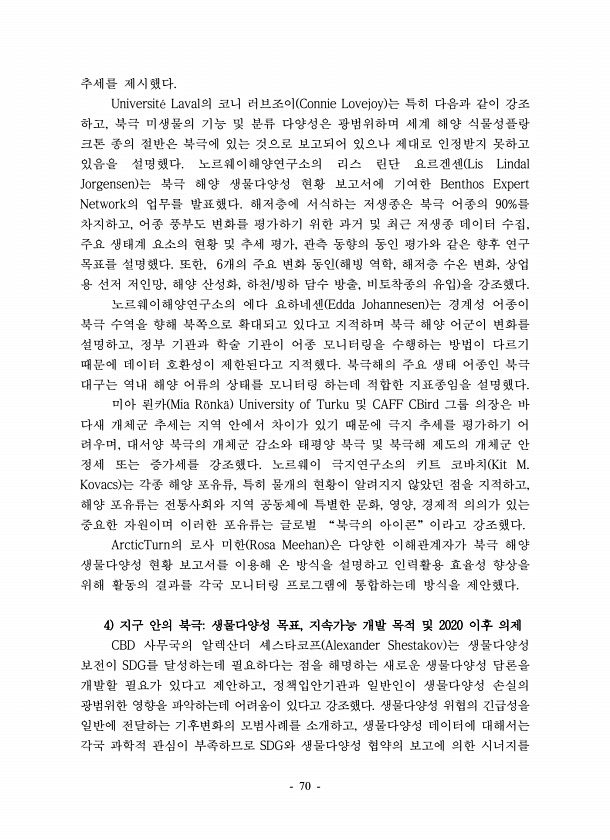 70 추세를 제시했다. Universit? Laval의 코니 러브조이 Connie Lovejoy 는 특히 다음과 같이 강조 하고, 북극 미생물의 기능 및 분류 다양성은 광범위하며 세계 해양 식물성플랑 크톤 종의 절반은 북극에 있는 것으로 보고되어 있으나 제대로 인정받지 못하고 있음을 설명했다. 노르웨이해양연구소의 리스 린단 요르겐센 Lis Lindal Jorgensen 는 북극 해양 생물다양성 현황 보고서에 기여한 Benthos Expert Network의 업무를 발표했다. 해저층에 서식하는 저생종은 북극 어종의 90%를 차지하고, 어종 풍부도 변화를 평가하기 위한 과거 및 최근 저생종 데이터 수집, 주요 생태계 요소의 현황 및 추세 평가, 관측 동향의 동인 평가와 같은 향후 연구 목표를 설명했다. 또한, ...