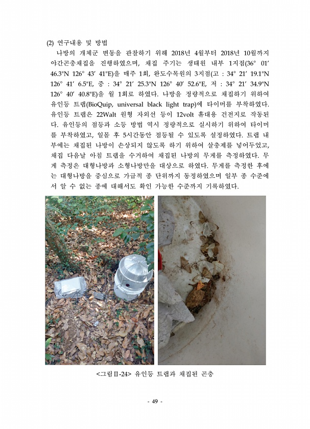 49 2 연구내용 및 방법 나방의 개체군 변동을 관찰하기 위해 2018년 4월부터 2018년 10월까지 야간곤충채집을 진행하였으며, 채집 주기는 생태원 내부 1지점 36° 0146.3N 126° 4341E 을 매주 1회, 완도수목원의 3지점 고 34° 2119.1N 126° 416.5E, 중 34° 2125.3N 126° 4052.6E, 저 34° 2134.9N 126° 4040.8E 을 월 1회로 하였다. 나방을 정량적으로 채집하기 위하여 유인등 트랩 BioQuip, universal black light trap 에 타이머를 부착하였다. 유인등 트랩은 22Walt 원형 자외선 등이 12volt 휴대용 건전지로 작동된 다. 유인등의 점등과 소등 방법 역시 정량적으로 실시하기 위하여 타이머 를 부착하였고, ...